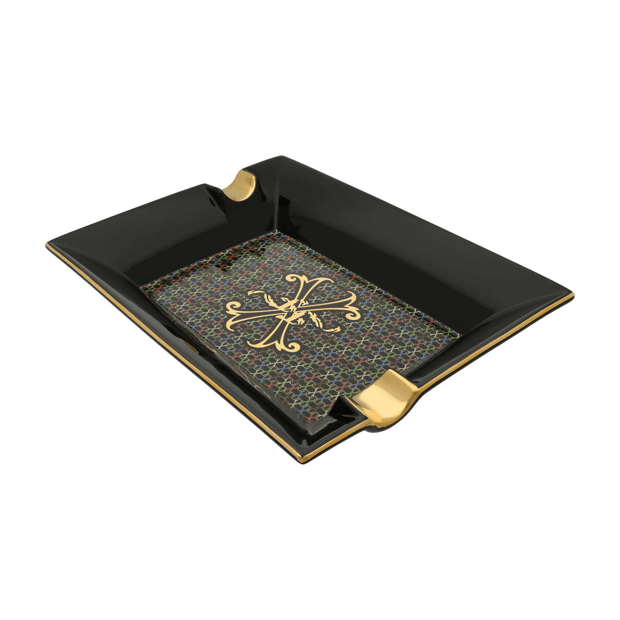 Ashtray - Black lacquer decorated with the multicolor X monogram and Opus X Fuente crest at the center. Hand-painted gold finishes on the grooves.