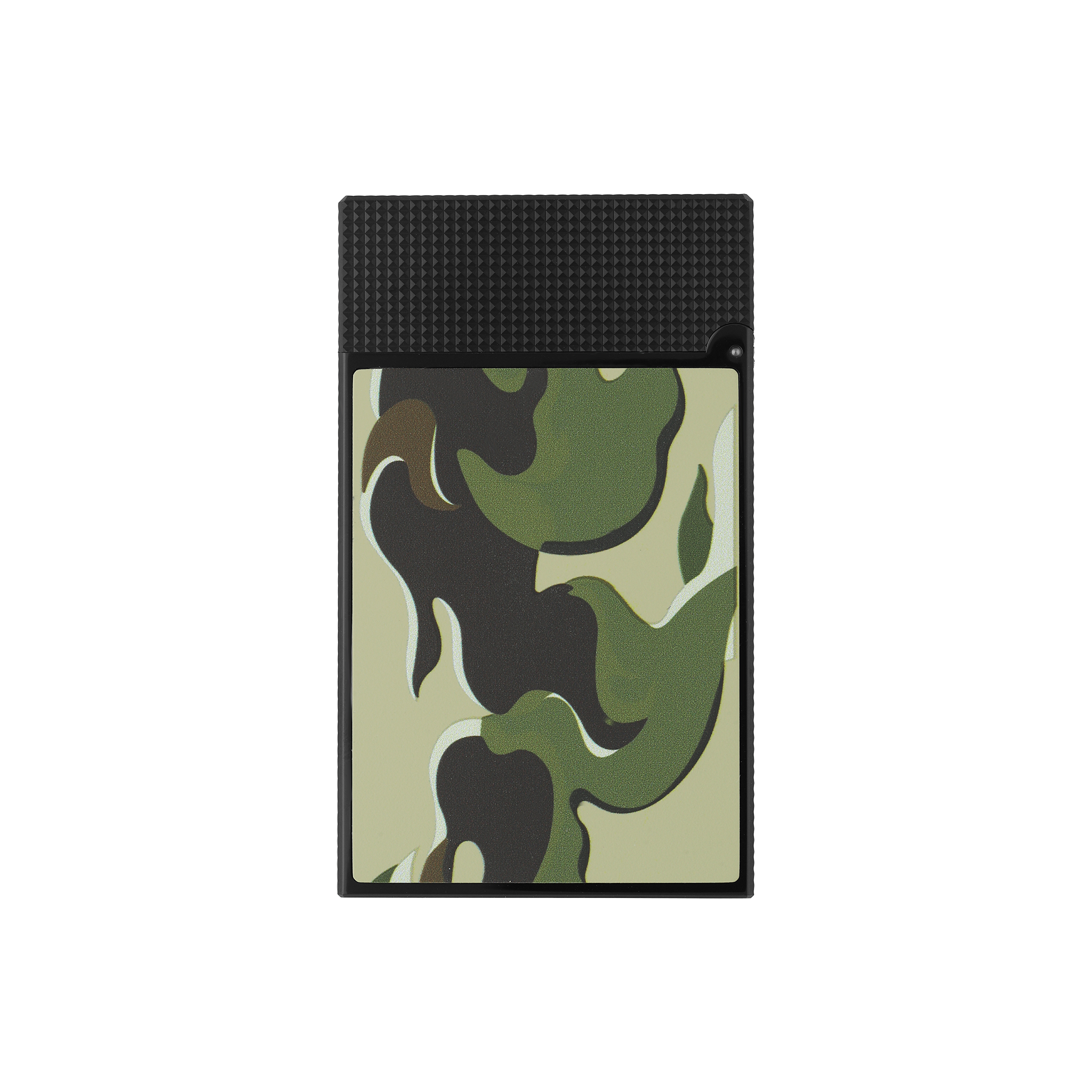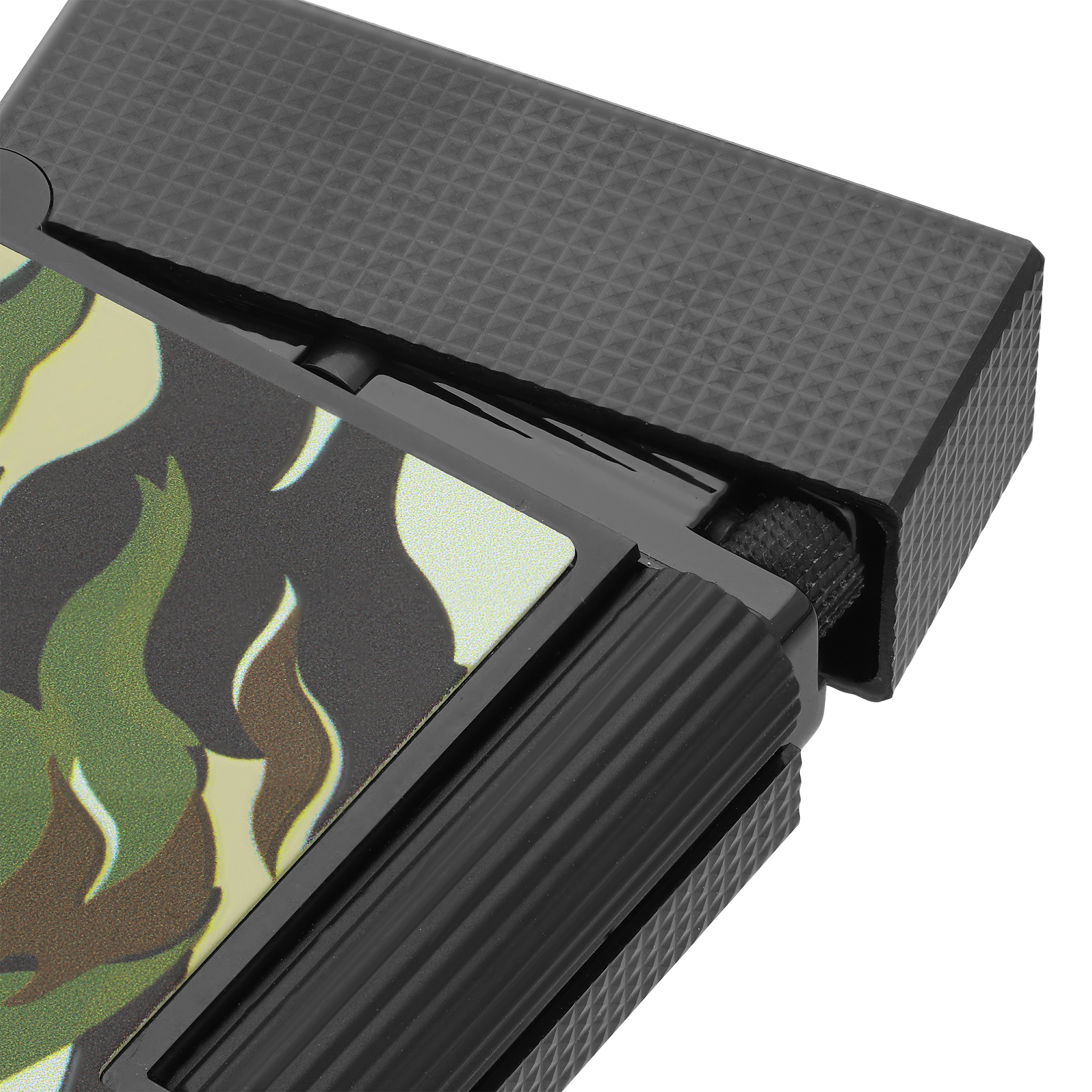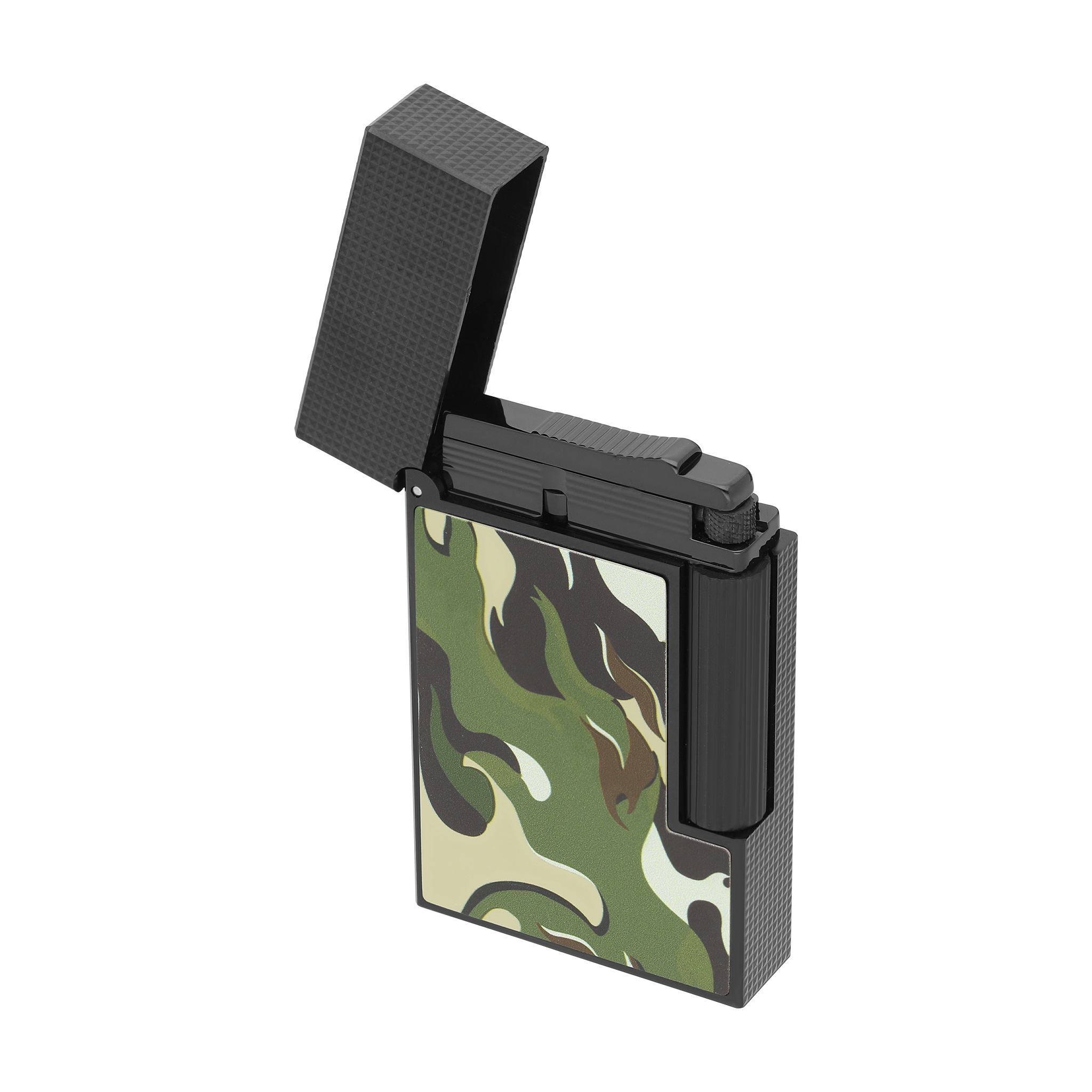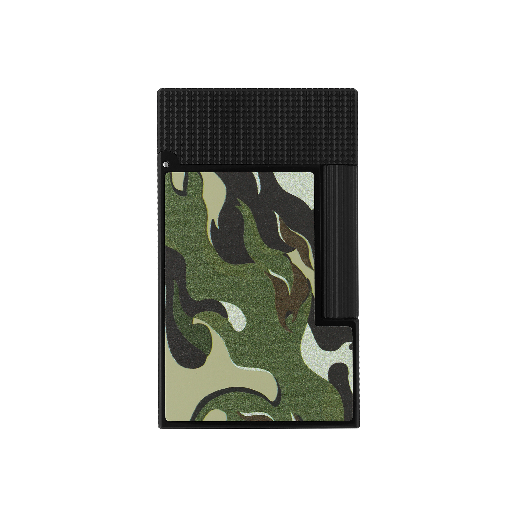 This year, S.T. This year, S.T. Dupont reintroduces the camouflage motif on its iconic products, with a fresh, bold interpretation of the legendary design, featuring flames in vibrant shades of red and green. Ligne 2 Cling lighter guilloche under lacquer with green Camouflage motif, black finish