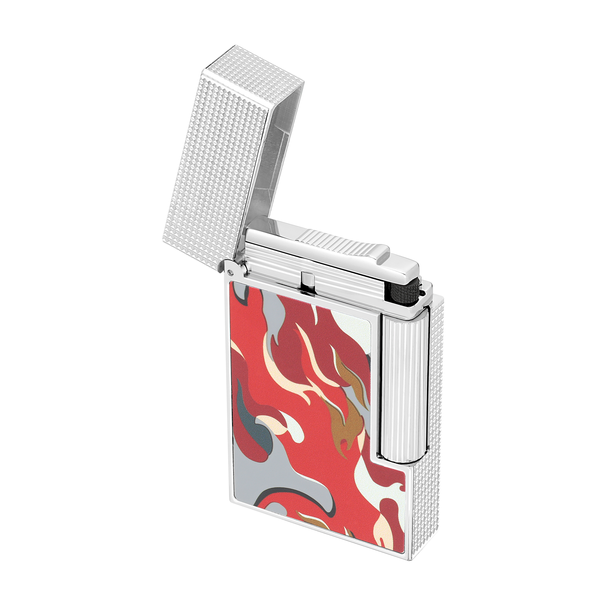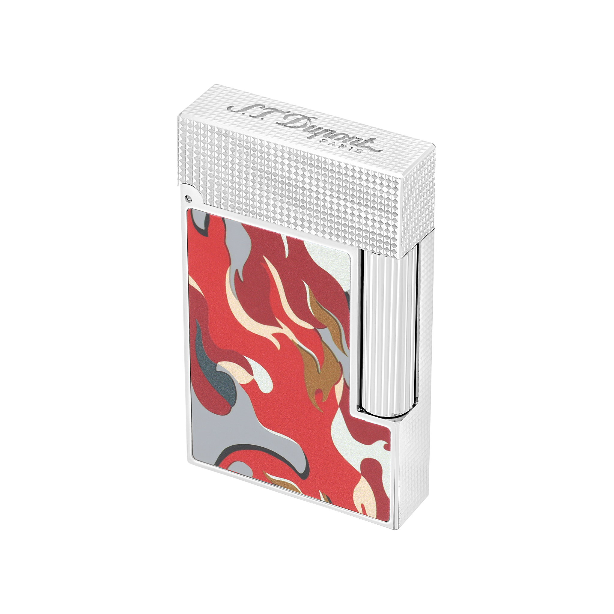 This year, S.T. This year, S.T. Dupont reintroduces the camouflage motif on its iconic products, with a fresh, bold interpretation of the legendary design, featuring flames in vibrant shades of red and green. Ligne 2 Cling lighter guilloche under lacquer with red Camouflage motif, palladium finish