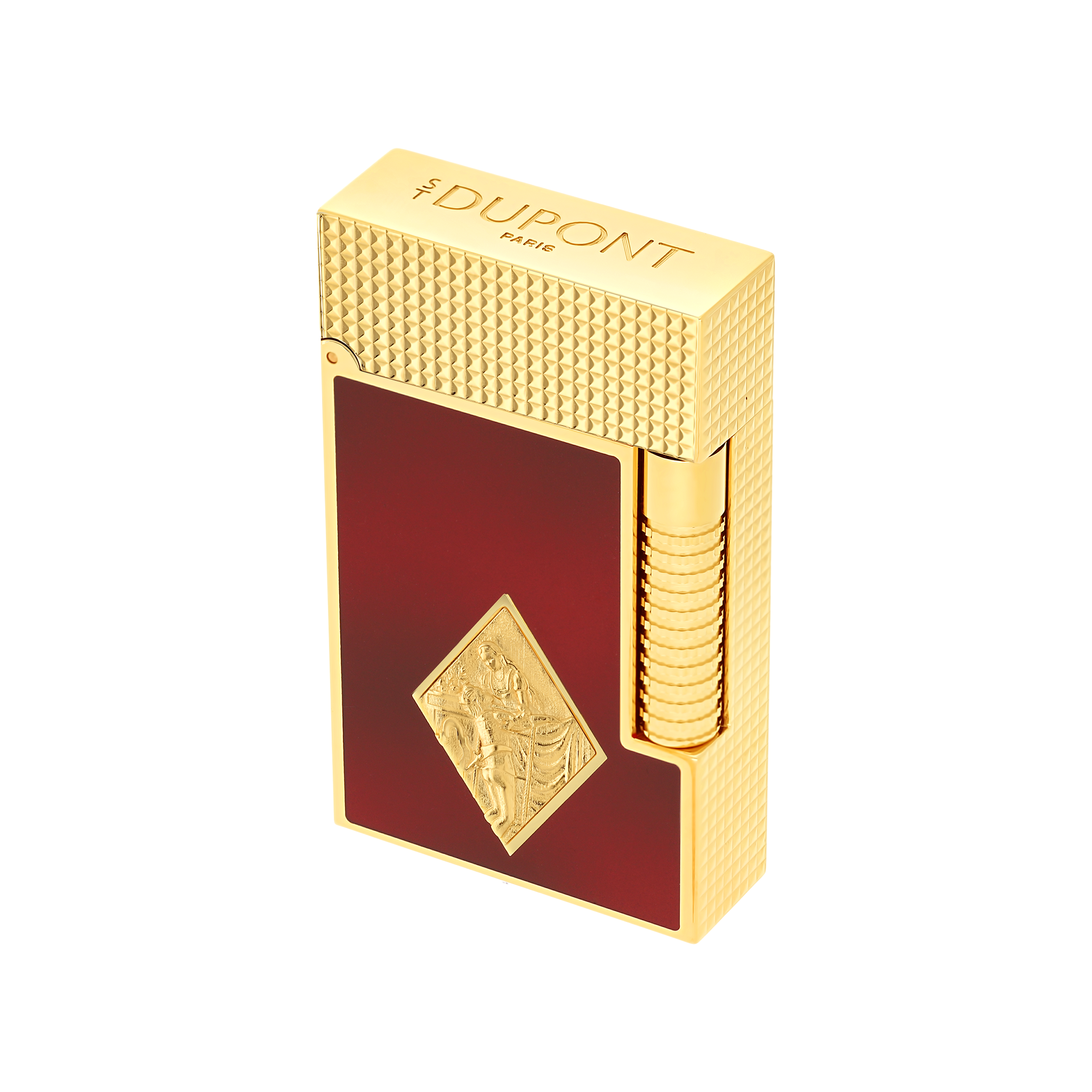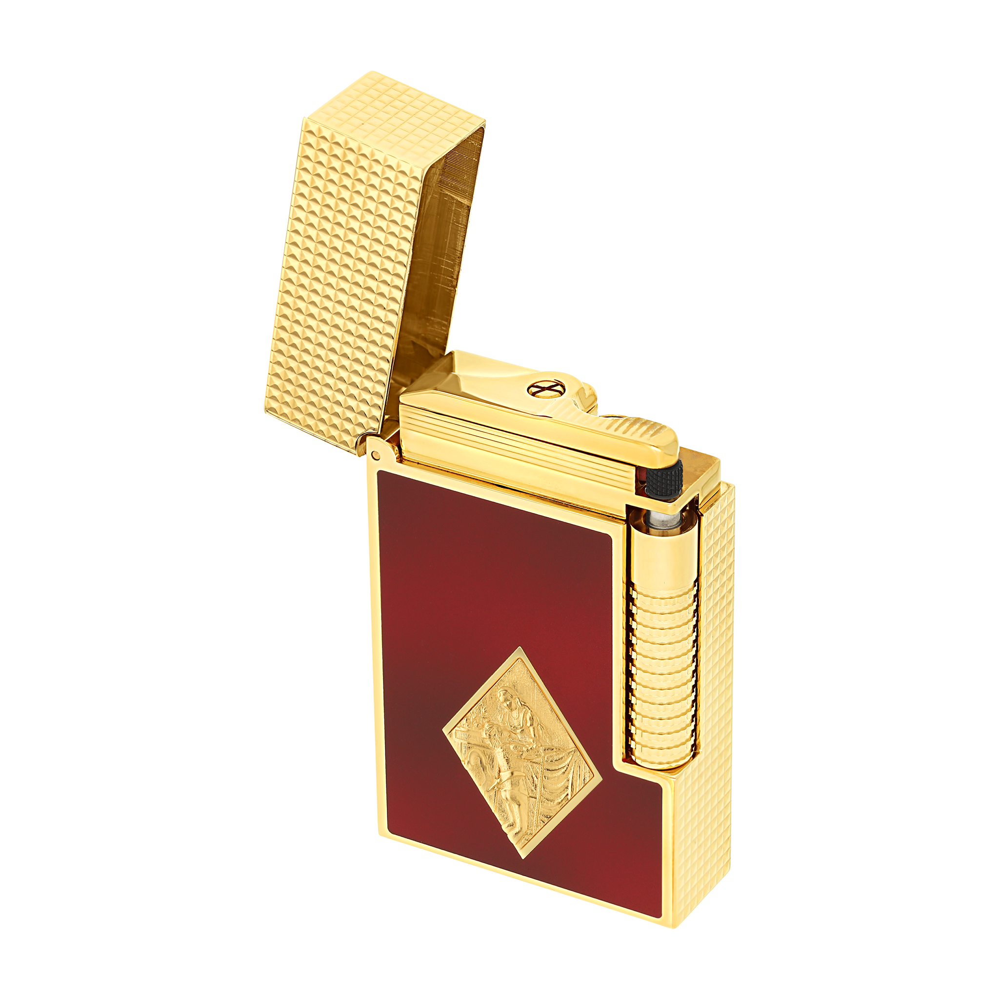 To celebrate the 150th anniversary of Romeo and Julieta, S.T. Dupont signs an exclusive collaboration inspired by the strength of passion and expertise. A tribute to the art of exceptional cigars and the beauty of timeless objects. Lighter Le Grand Dupont Cling red lacquer shiny popote decorated with the medallion in gold finish pattern Romeo y Julieta. Diamond point guilloche hat. Yellow gold finish. Equipped with a double ignition system for yellow flame or blue flame.