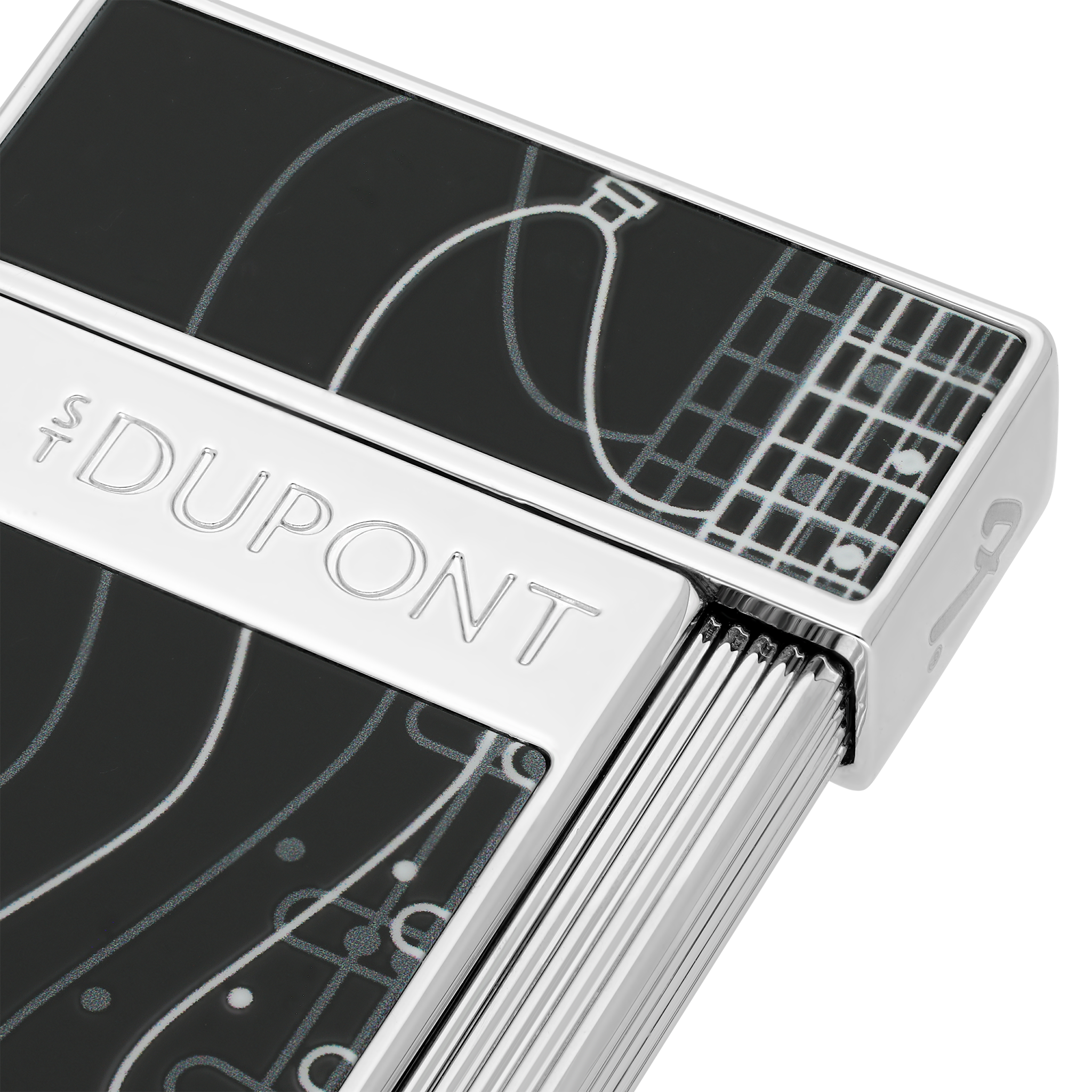 For the second time, S.T. Dupont and Fender® are working together to create a rock line that combines the expertise of both companies. The Biggy, Slimmy and Twiggy lighters, as well as the Initial ballpoint pen take up the silhouette of a Stratocaster® on a black lacquer background. Slimmy Fender® lighter. Blue torch flame 1 cm. Adjustable flame. Silver finish.