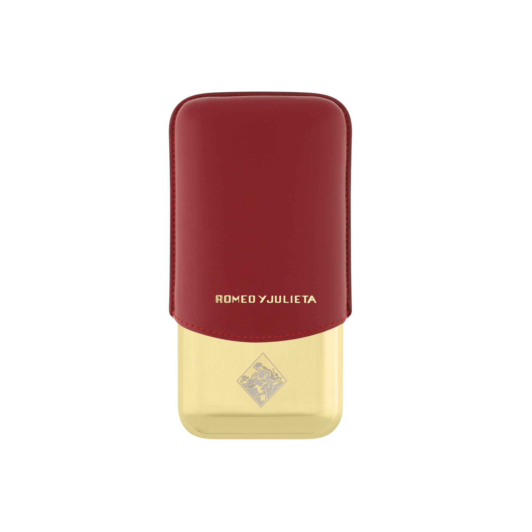 Case for 3 cigars with Romeo and Julieta gold embossed logo. Calf leather. Golden base with engraved logo of the Romeo and Julieta coat of arms on the front and the inscription of the brand on the back.