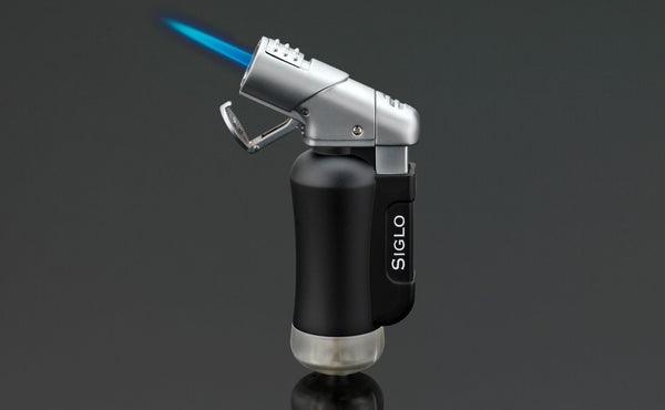 Every SIGLO Streamliner lighter has a gas window, flame adjuster control and a cigar puncher. The blue butane flame is at an angle and is of a flower shape. The angled flame allows for lighting of thick ring gauge cigars.