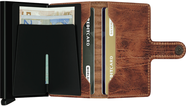 Small in size and surprisingly large in storage capacity, the Miniwallet combines the best of both worlds. The exterior holds banknotes, receipt and cards, while the aluminium Cardprotector allows you to slide out cards with one simple motion and protects them from bending, breaking and unwanted wireless communication.