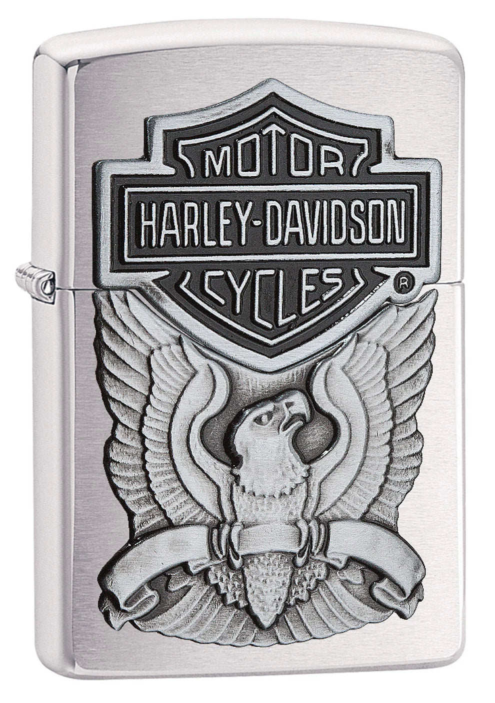 This Brushed Chrome lighter has a Harley-Davidson emblem attached. Comes packaged in a gift box. For optimal performance, fill with Zippo lighter fluid.