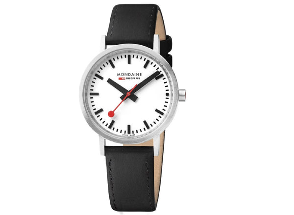 The stainless steel model with its brushed mat metal makeover features Mondaine’s traditional SBB white dial with black hour and minute markers and sweeping red-dot seconds hand for a powerful and confident monochrome look. Suit it up or wear with denim, this timepiece is comfortably partnered with whatever you have in your wardrobe.