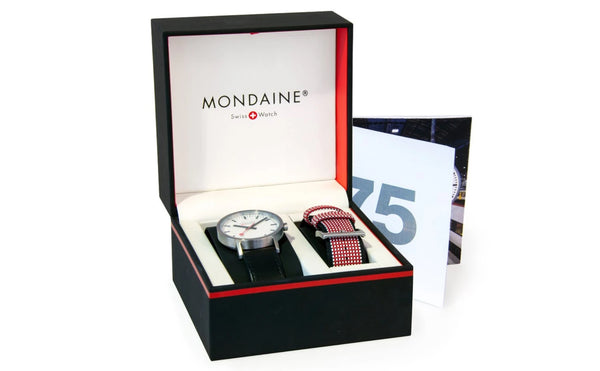 To celebrate the railway clock's 75th anniversary, Mondaine has created a special anniversary package to present the Classic, its 1986 watch. The box is marked with a large number 75, and fits both the watch as well as the additional textile wristband. The watch lives on through its three signature colours – red, white and black. The additional wristband is made from recycled PET bottles. The wristband has with Mondaine's new, quick-change system.