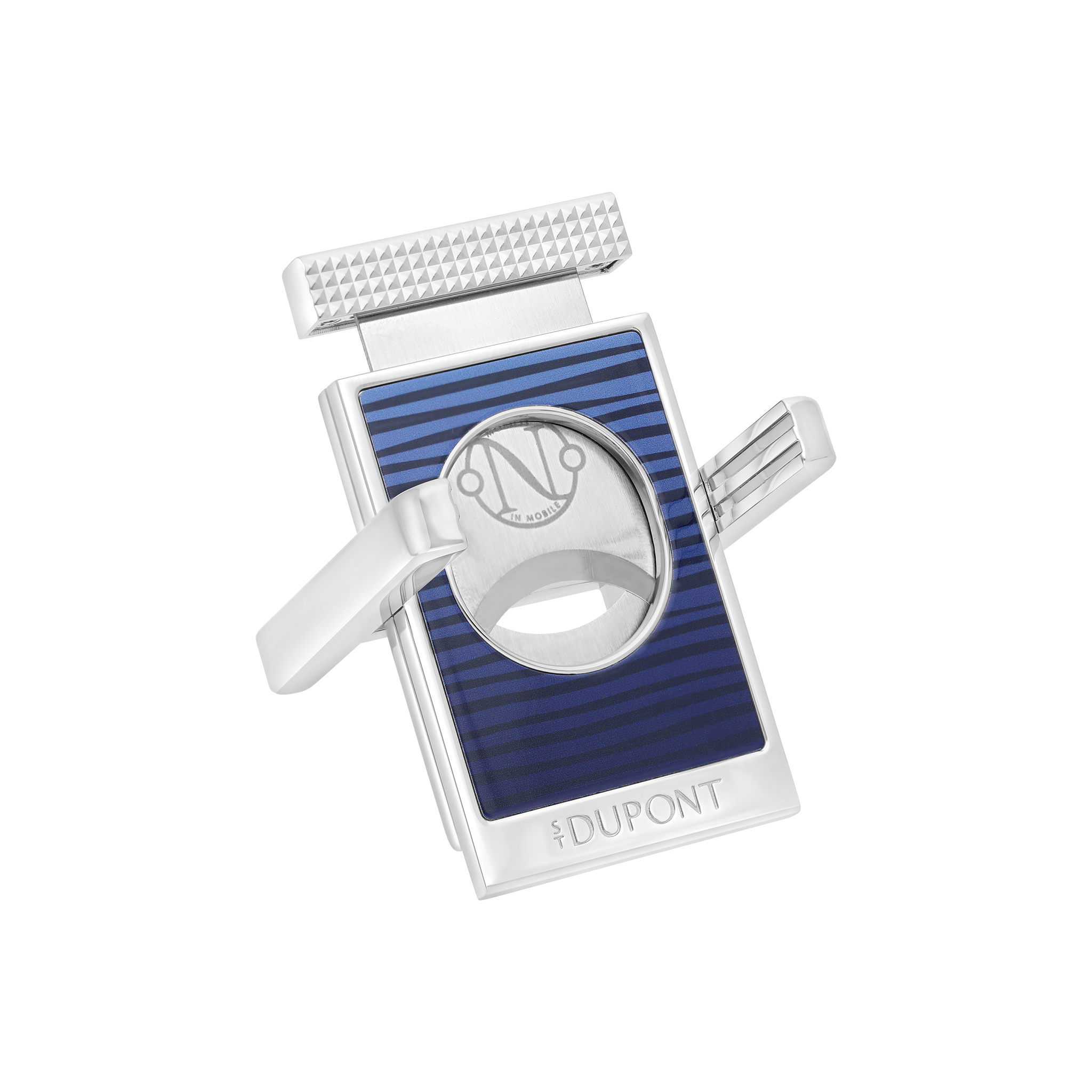 Cigar cutters stand decorated with a blue lacquer and the engraved Nautilus logo, chrome and shiny finishes.