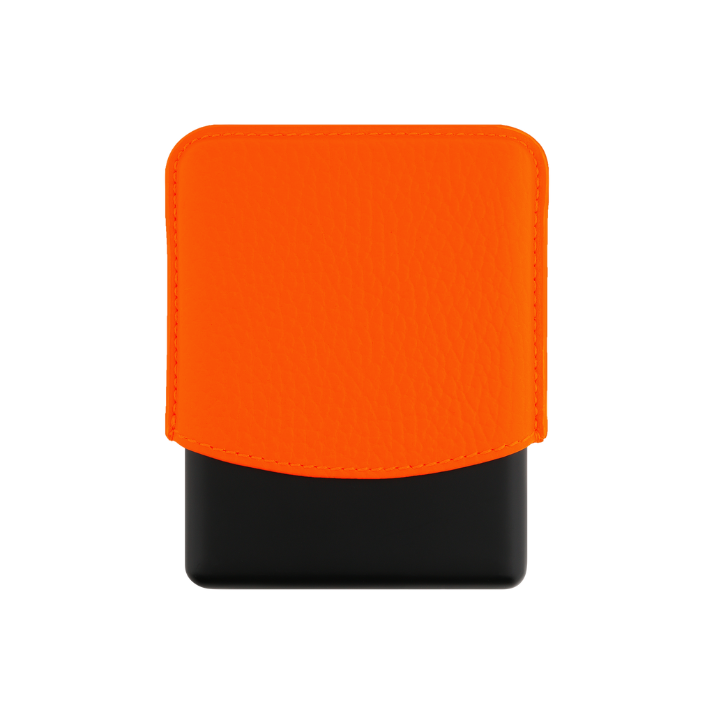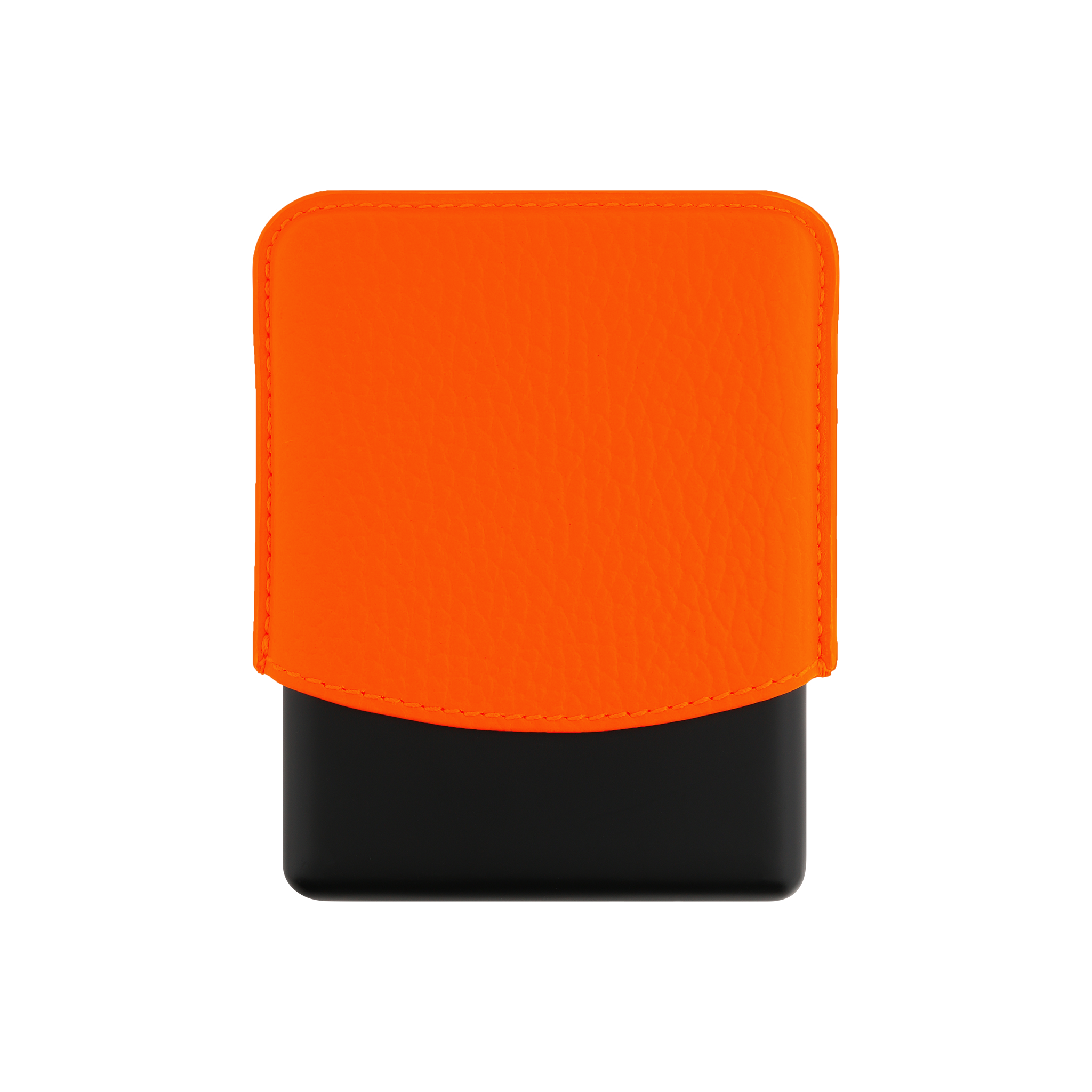 Cigarette case in fluo orange grained calf leather and matte black metal base.