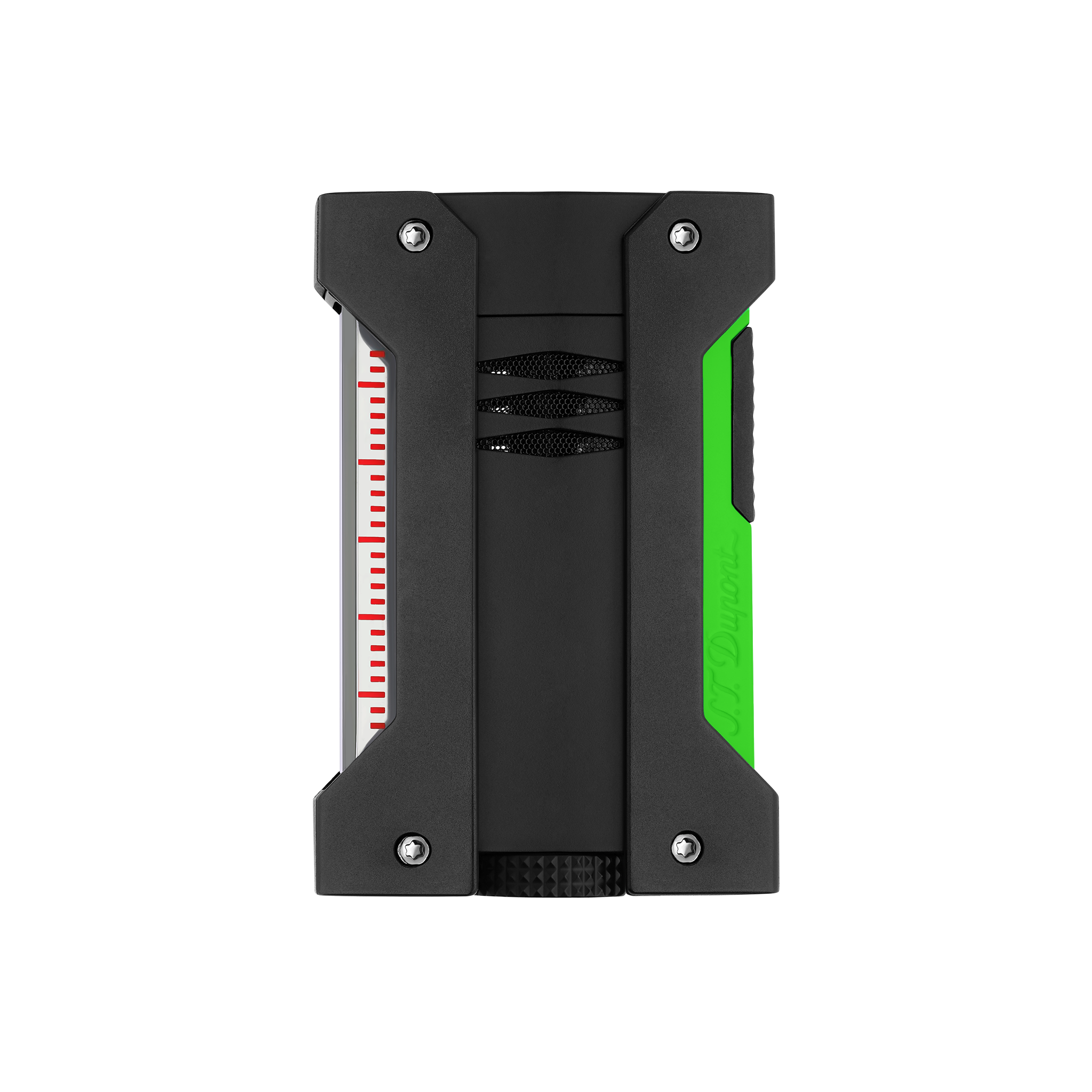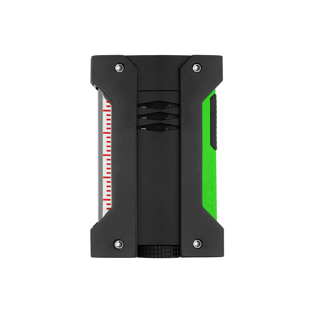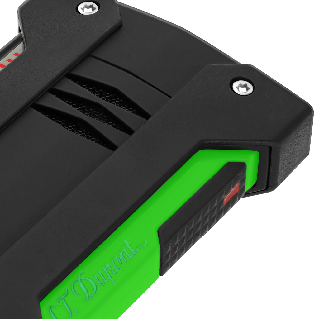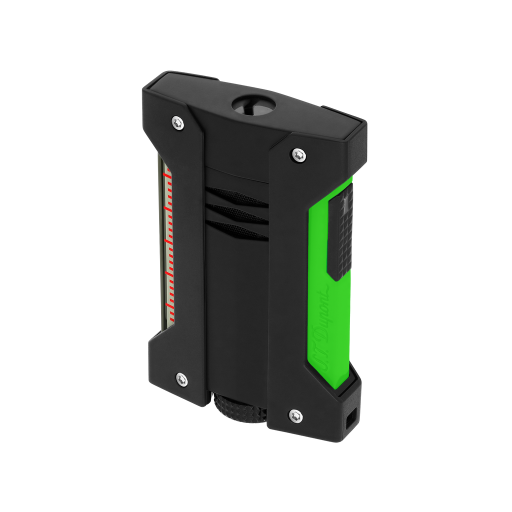 Extreme Défi lighter in matte black with fluorescent green trigger. Injection-molded metal body with a highly resistant semi-rigid protective cover. Powerful, wind-resistant blue torch flame.