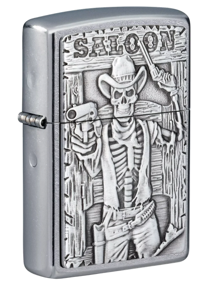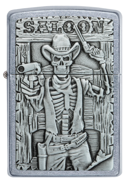 This Brushed Chrome windproof lighter has an emblem attached displaying a wolf in the wilderness. Comes packaged in a gift box. For optimal performance, fill with Zippo lighter fluid.