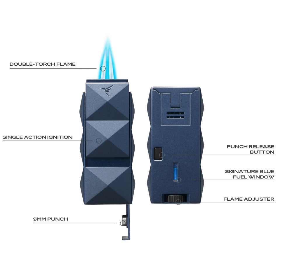 Quasar II: the latest addition to our signature Quasar series, marking the inception of our pocket-sized collection designed to complement the entire line. Whether you're showcasing it indoors or out, the Quasar II offers a unique blend of elegance and functionality. This dual-flame lighter can be effortlessly activated with a simple thumbs-up motion, providing an intense and precise heat source for lighting cigars. It also boasts a trigger-release punch cutter that deploys through the push of a button. Its front showcases a flawless design that conceals a host of sophisticated features, including a fuel wheel and a fuel window.