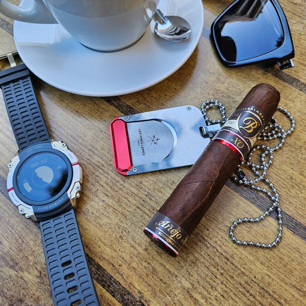 Featuring two plates, one concealing a double blade and the other showcasing an engraved neo-military inspired design, this elegant and discreet accessory identifies you as a cigar aficionado.