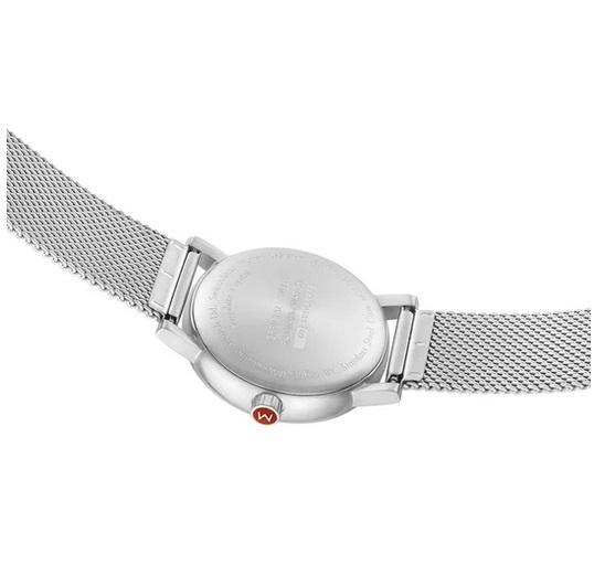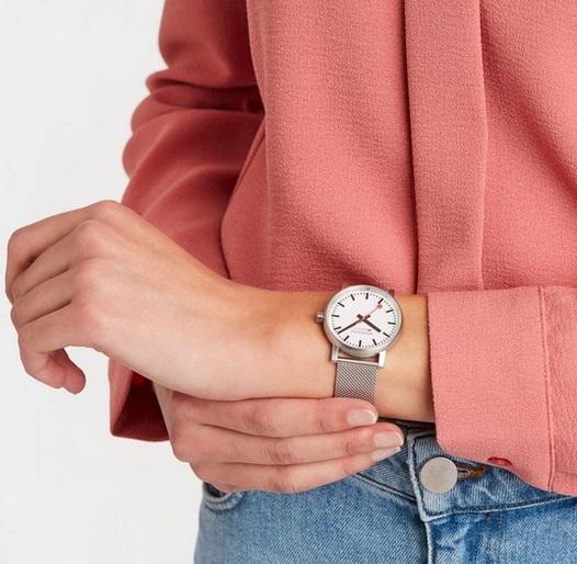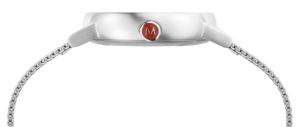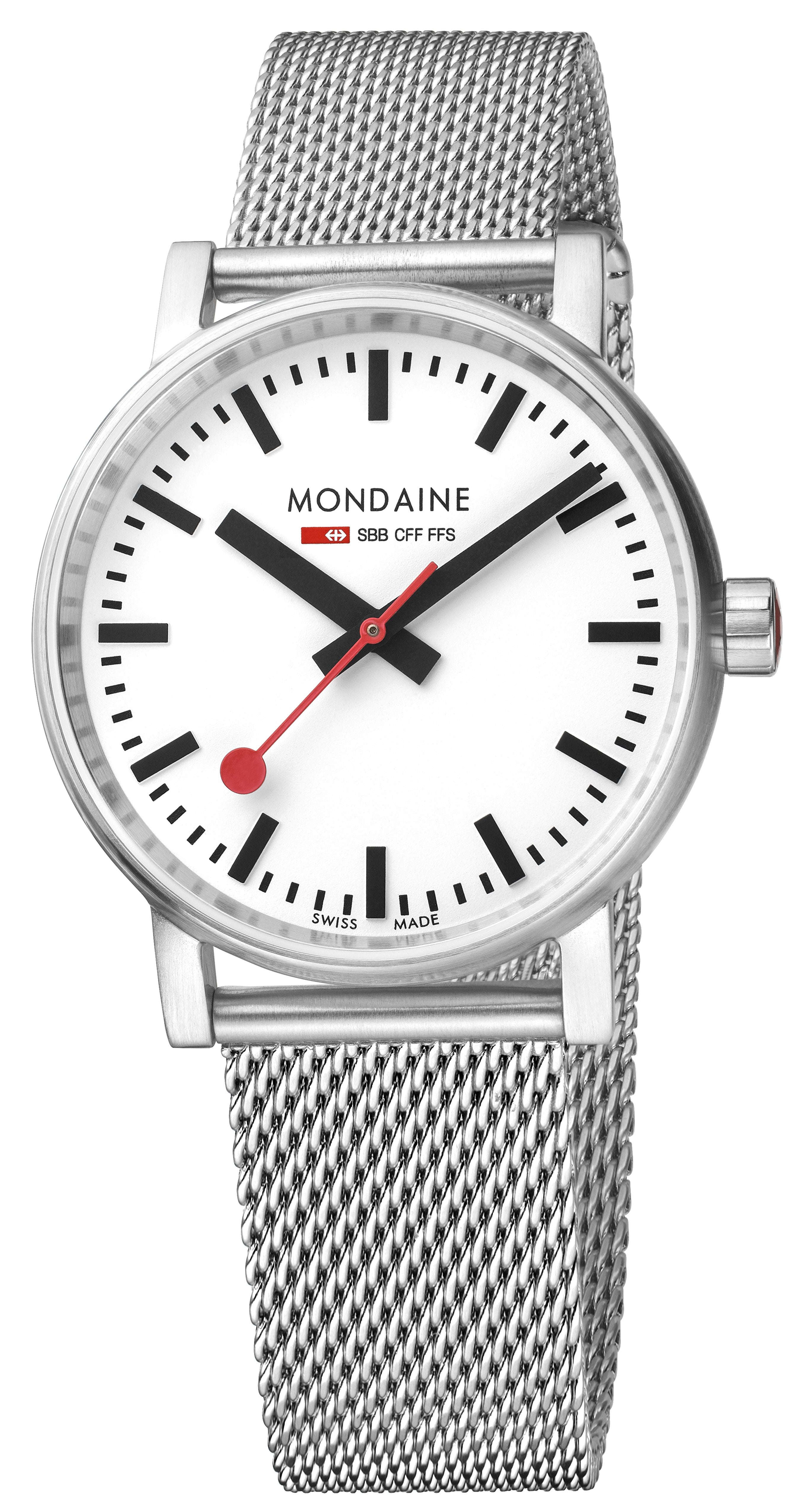 Evolutionary design With its harmoniously designed polished stainless steel case and 30mm diameter, this Mondaine watch is a real statement and very comfortable to wear. The hardened mineral crystal protects the iconic dial which includes date indication. Thanks to its minimalistic design the watch is highly readable. The milanaise mesh band is a real eye-catcher.