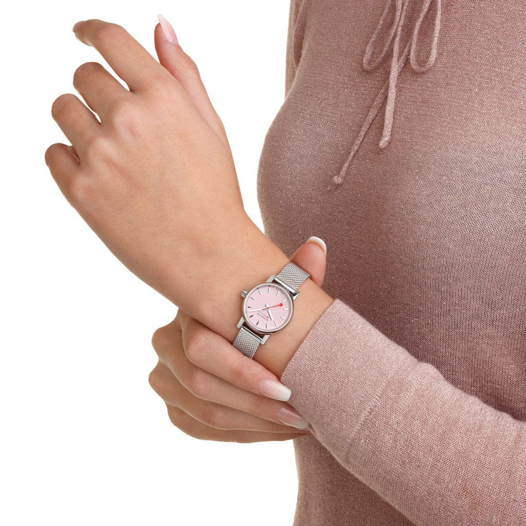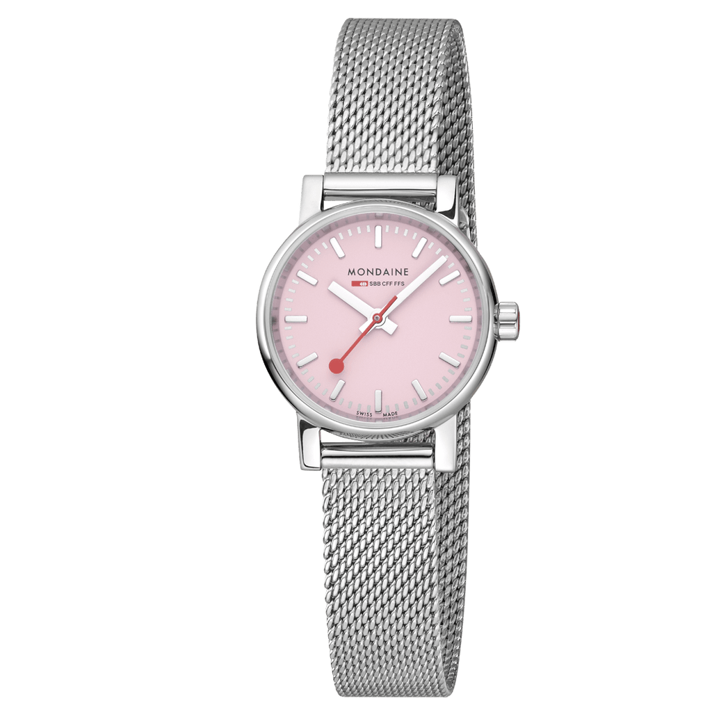Our seasonal evo2 watch collection showcases a 26mm stainless steel case with a polished finish and a light rose dial. Completed by a silver tone Milanese mesh band made of stainless steel with a practical interchangeable strap system which allows the strap to be changed quickly and easily. The minimalist design of the Swiss railway watch style is easy to read and features the iconic red second hand and a rounded, organic shape watchcase. Handcrafted in our solar-powered factory in Switzerland, the watch embodies Swiss quality and watchmaking tradition while also aiming to protect and preserve our planet.