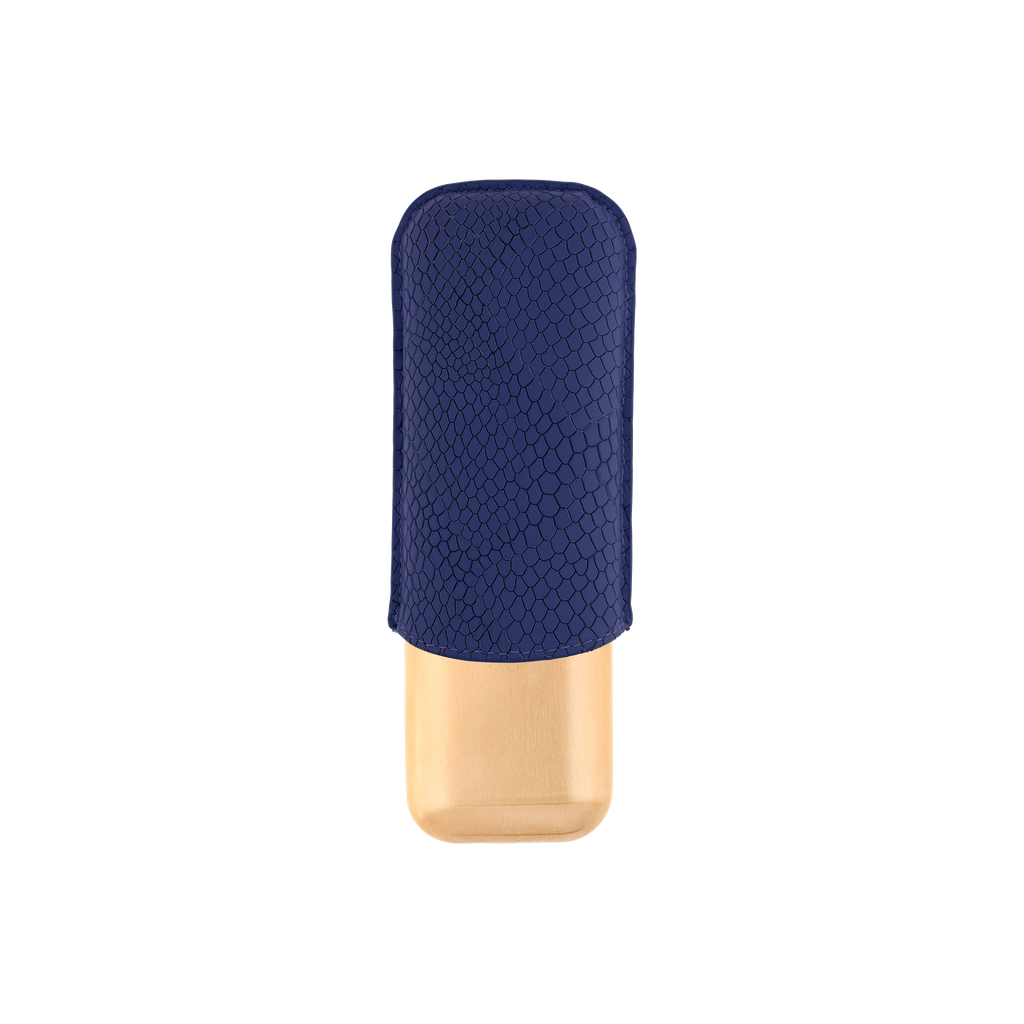 Leather cigar case for two cigars in royal blue color with golden metal base. The case is decorated with the new dragon scale guilloche. Carefully designed, this case holds 2 cigars. Perfect when travelling, this accessory is an ideal companion for cigar connoisseurs looking for a practical yet stylish solution to safely store and transport their cigars.