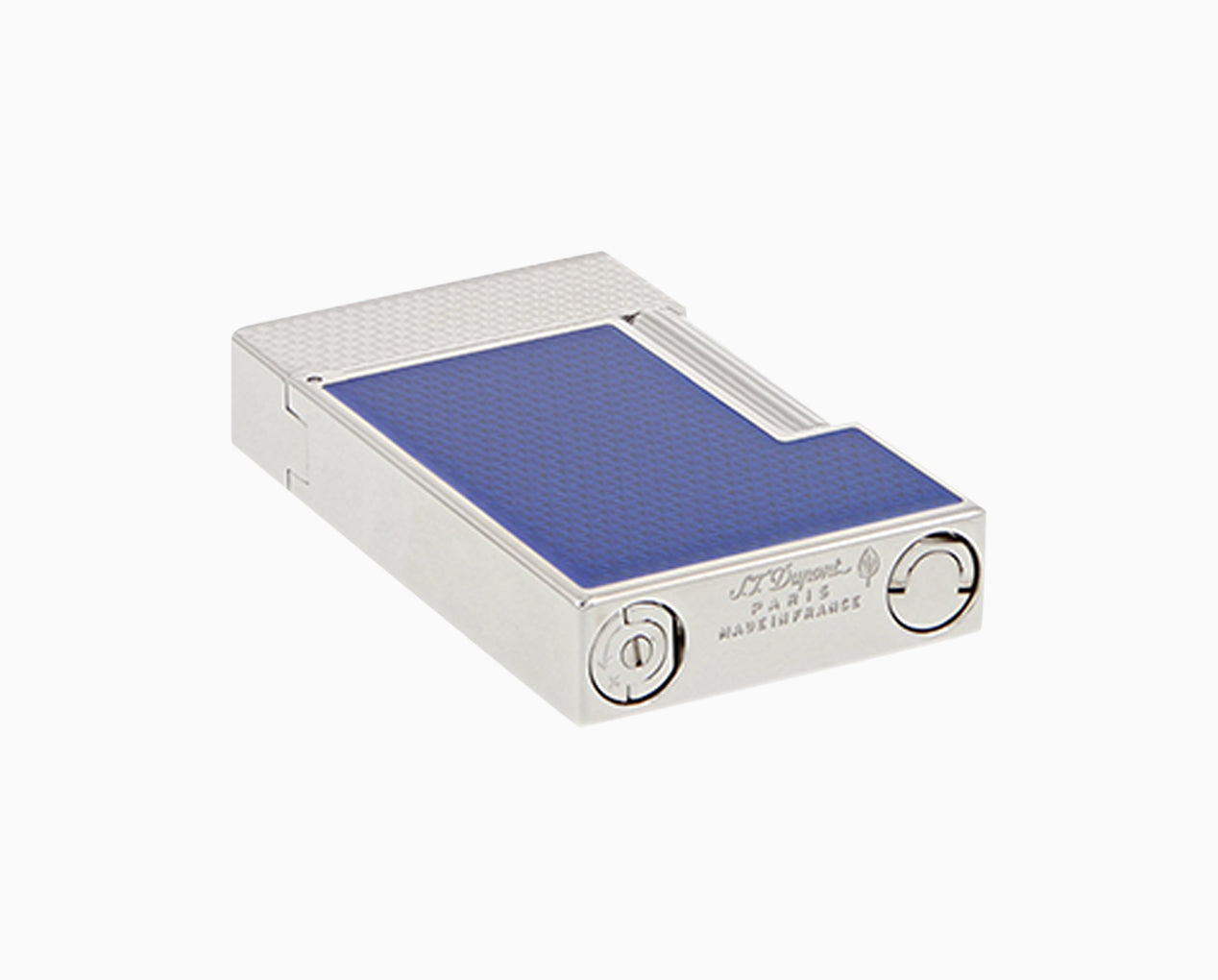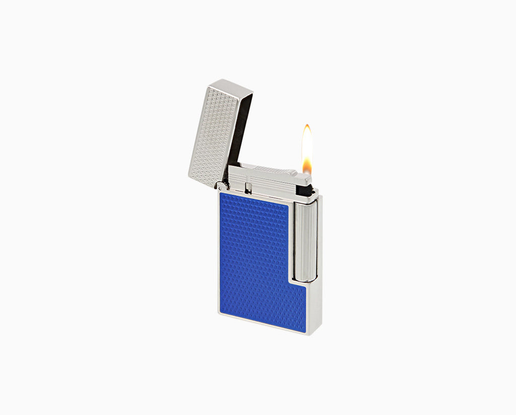 Large classic Ligne 2 lighter with palladium fire head finish, electric blue lacquer guilloche and signature “cling” sound. Gentle and adjustable double flame.