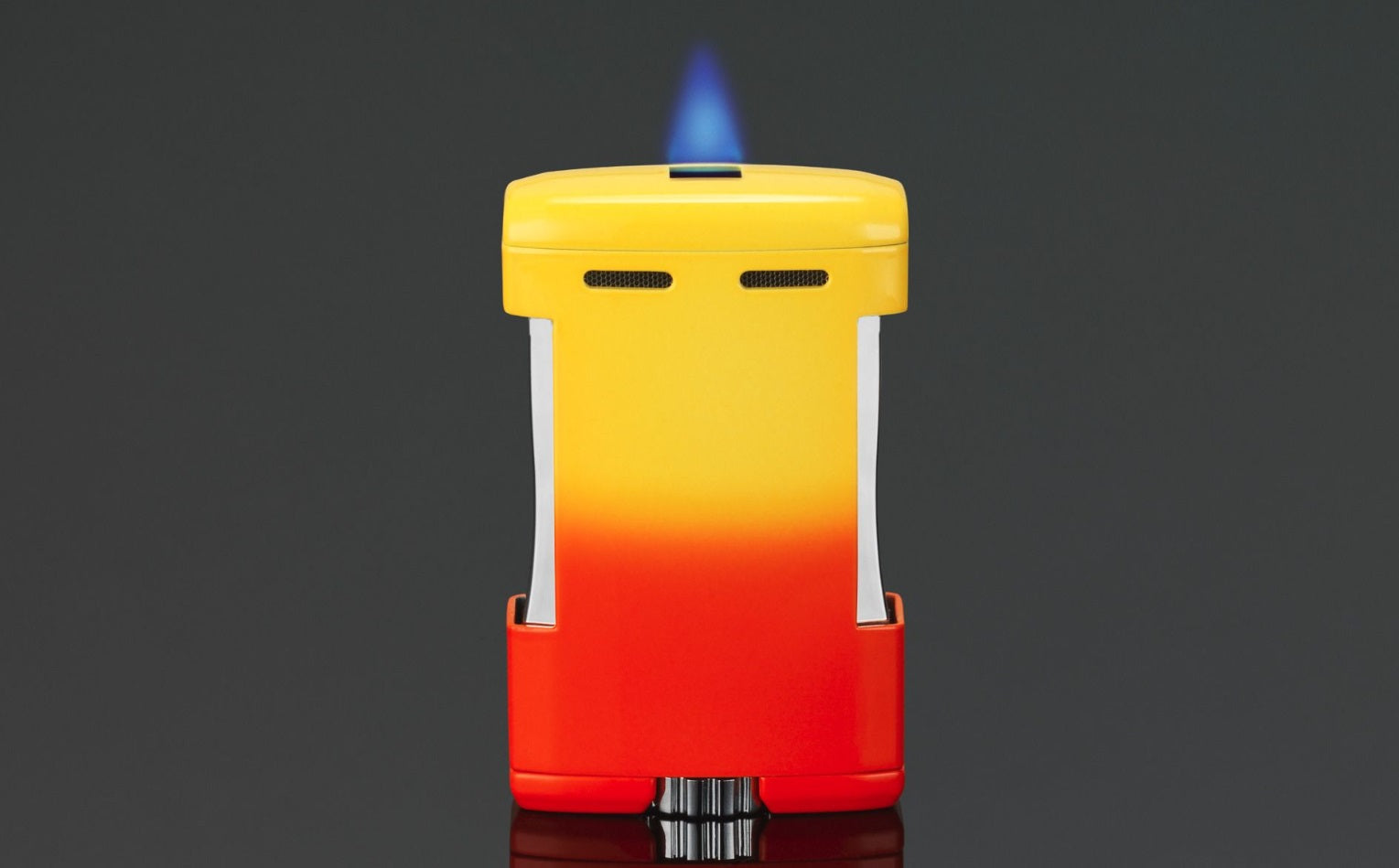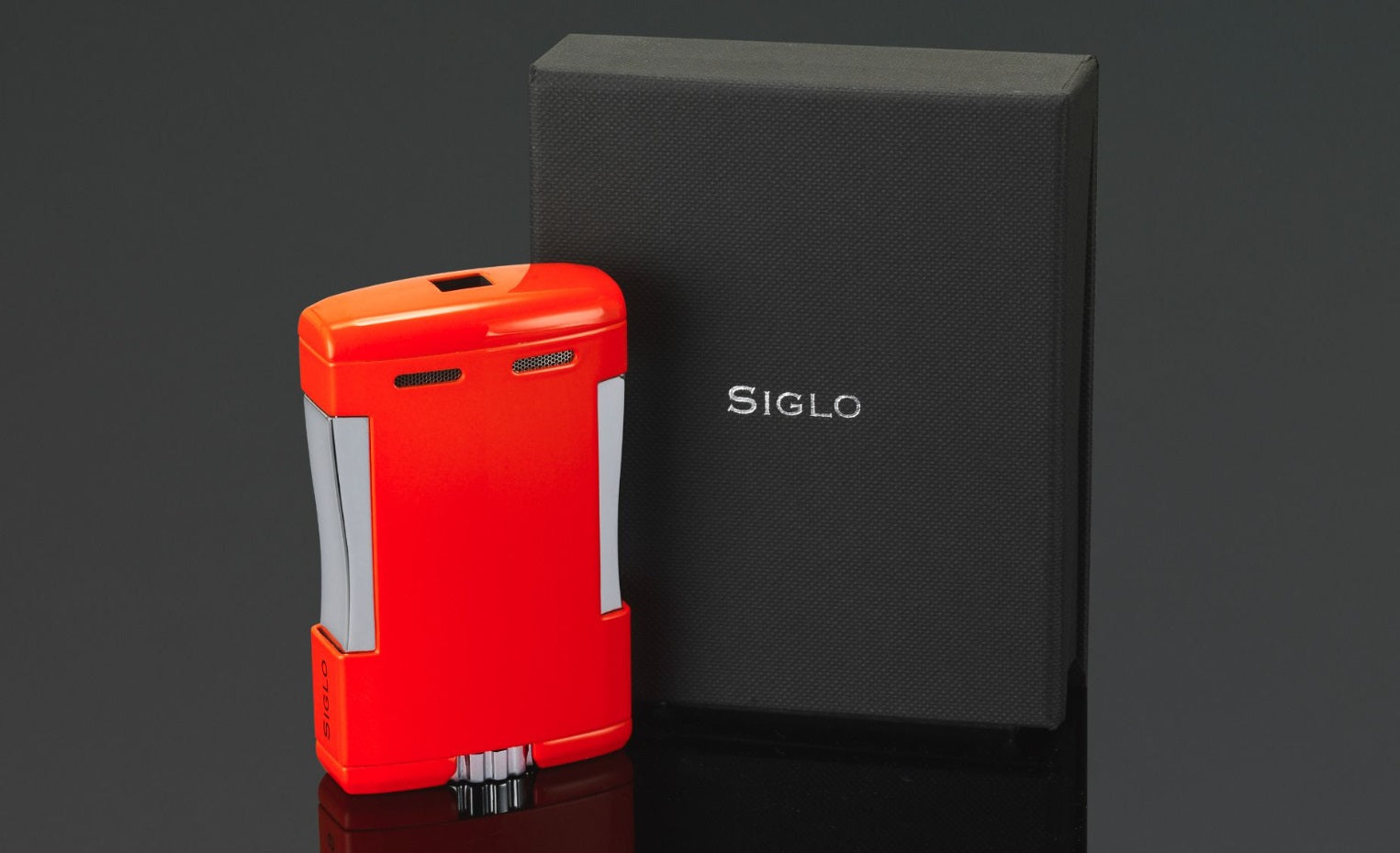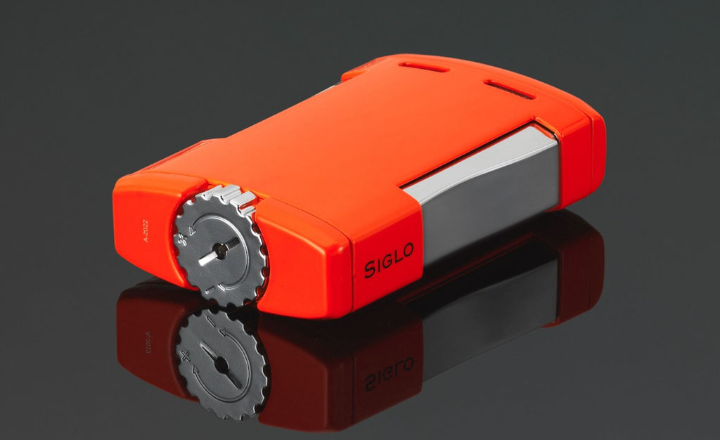 Illustrating sunrise, this lighter changes from orange to yellow as you light up your cigar. Simply press the two side buttons, a square flame lights up. This new SIGLO torch will definitely be your best buddy at home, office or your secret hideout. A big flame adjuster in the shape of a wheel is located at the bottom, for easy handling. Individual packed in a beautiful gift box.