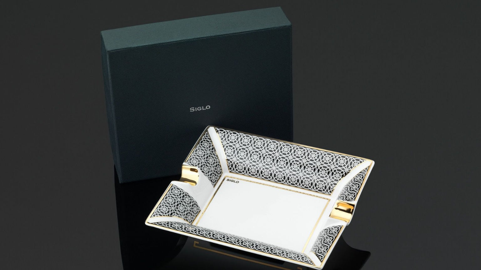 Of simple yet elegant geometry patterns, this SIGLO Opulent II ashtray comes with beautiful footing. Made of fine bone china, it is translucent and luxurious. With a deep dish to hold your cigar ash, this is an elegant piece for all cigar aficionados.