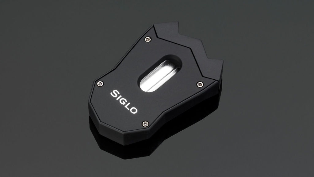 Taking its design language from the Colibri Quasar series of luxury desktop humidors and cigar ashtrays that feature a four-sided pyramidal peak motif, the Quasar cutter is beautifully and deceptively simple. On two opposing sides of the Quasar are housed a “V-Cut” blade on one, and an “S-Cut” blade on the other. The cutter is engaged by pushing down on the top peak of the Quasar, which releases and pops up the cutting unit with both blades ready in unison. The V-Cut side cleanly cuts a wedge as deep as 7mm on a 60-ring for a full robust draw. The straight cut provides an equally crisp straight cut on cigars up to a 70-ring. Both sides will cut torpedoes with equal efficacy and ease. The construction of the Quasar is equally impressive as its stunning design. The body is a sturdy all-metal form. The top peak holds the blades and runs on oiled quad pistons to ensure absolute smooth action when in motion. The undercarriage is lined along the perimeter with a strong rubber gasket for non-slip stability while in use and to prevent damage to the desktop. In the center of the undercarriage is a twist cap to access the internal chamber for retrieving and disposing of the collected cigar clippings.