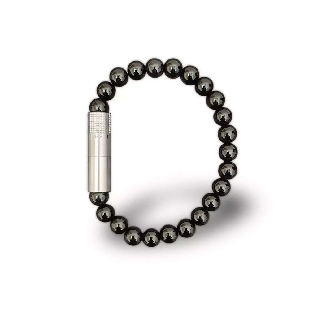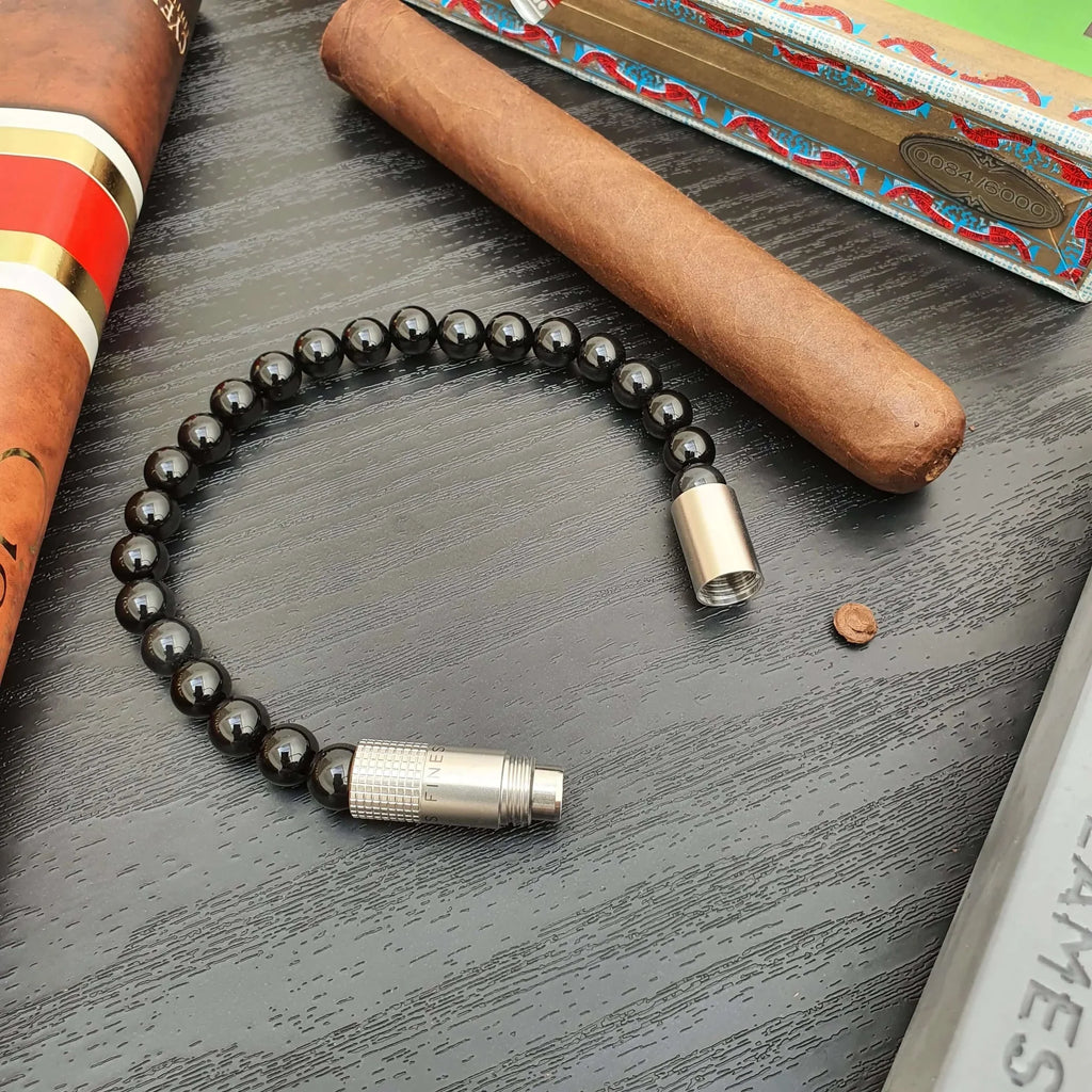 Symbol of strength and self-confidence, the Onyx stone has been used since the dawn of time. We choose to use it for punching cigars, assembling the punch with smaller Onyx beads, this discrete bracelet will easily fit with your everyday style.
