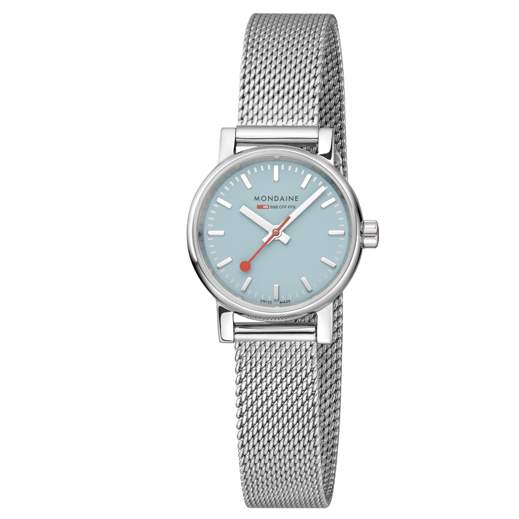 Our seasonal evo2 watch collection showcases a 26mm stainless steel case with a polished finish and a 'Turquoise Lake' dial which takes its inspiration from the stunningly crystal-clear blue water of Swiss lakes. Completed by a silver tone Milanese mesh band made of stainless steel with a practical interchangeable strap system which allows the strap to be changed quickly and easily. The minimalist design of the Swiss railway watch style is easy to read and features the iconic red second hand and a rounded, organic shape watchcase. Handcrafted in our solar-powered factory in Switzerland, the watch embodies Swiss quality and watchmaking tradition while also aiming to protect and preserve our planet.
