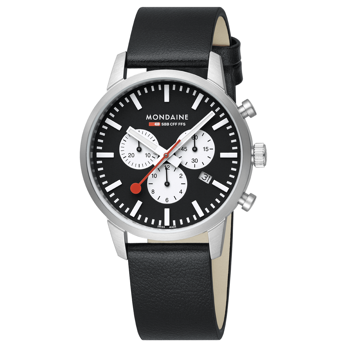 This sophisticated and masculine chronograph reverses the classic panda dial featuring a black dial with white sub-dials whilst seamlessly fusing this with the iconic Swiss Railways station design. The chronograph with a 41mm brushed stainless steel case introduces a new case shape unique to this line and is equipped with a date display and chronograph function allowing the wearer to track the date and measure elapsed time with precision. The top of the hands is equipped with SuperLuminova ensuring that time can be effortlessly read, regardless of the ambient light. The dial is protected by sapphire crystal with anti-reflective coating, a strong and scratch resistant material and is paired with a black vegan grape leather strap. Make a statement with this sophisticated and classic timepiece!