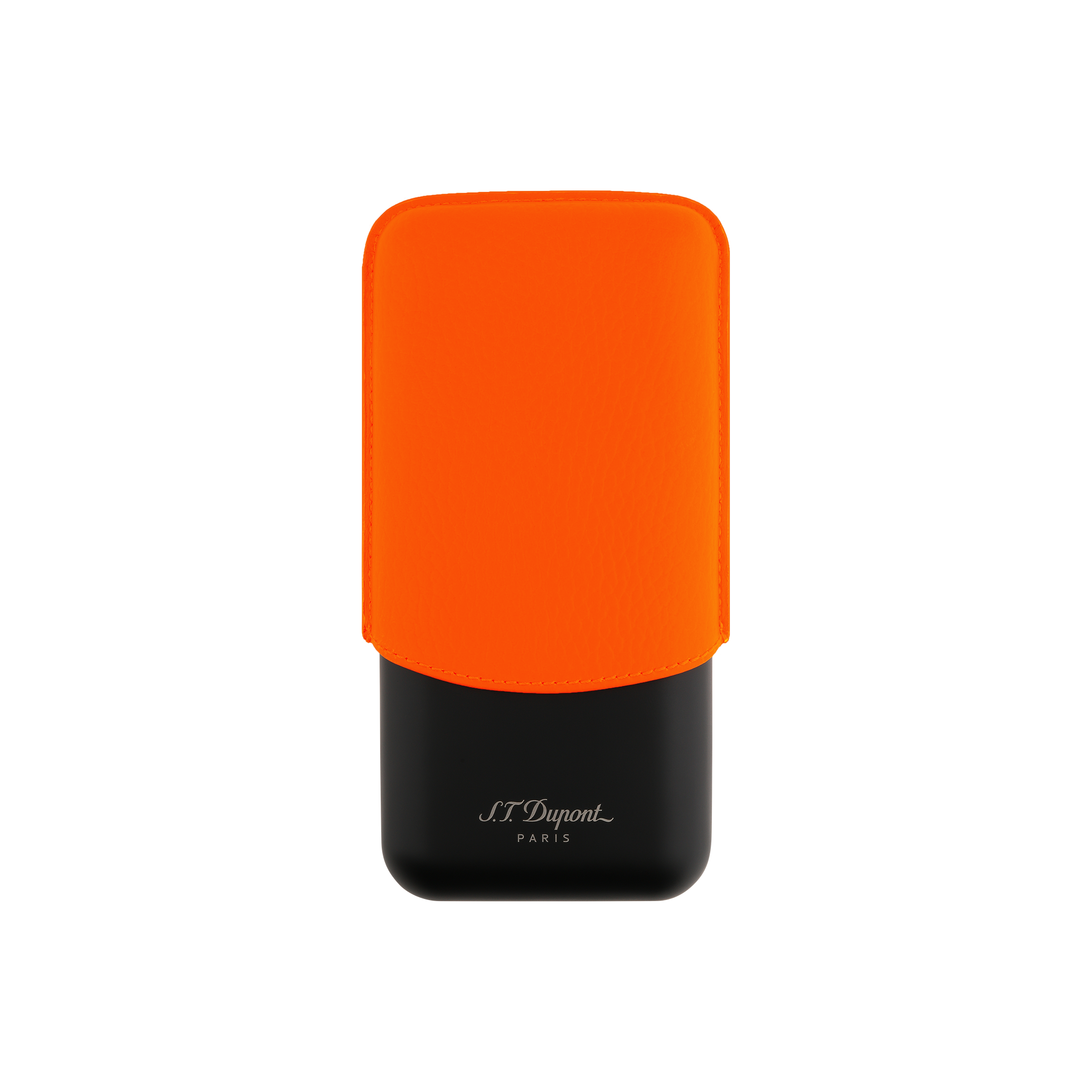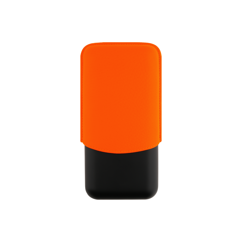 3-cigar case in fluorescent orange grained calf leather with matt black metal base.