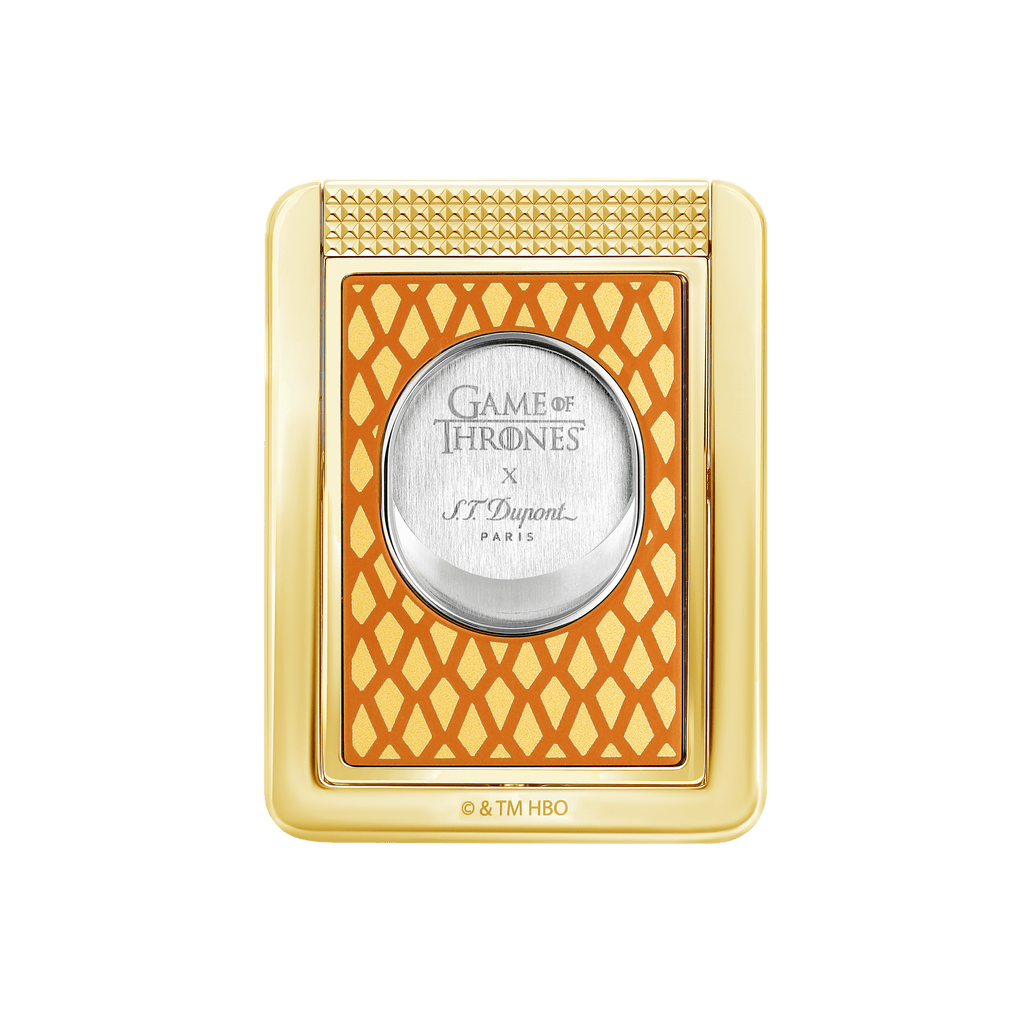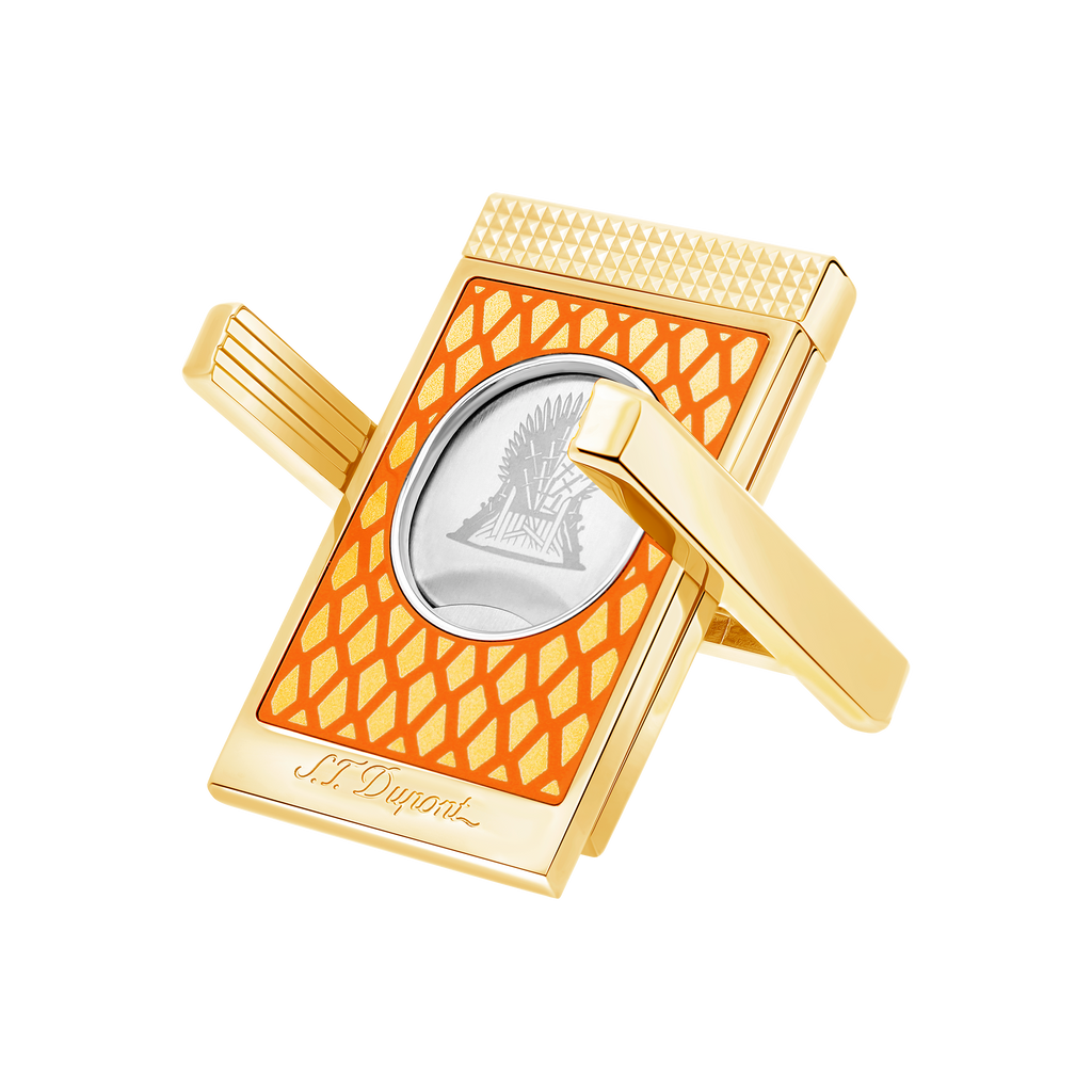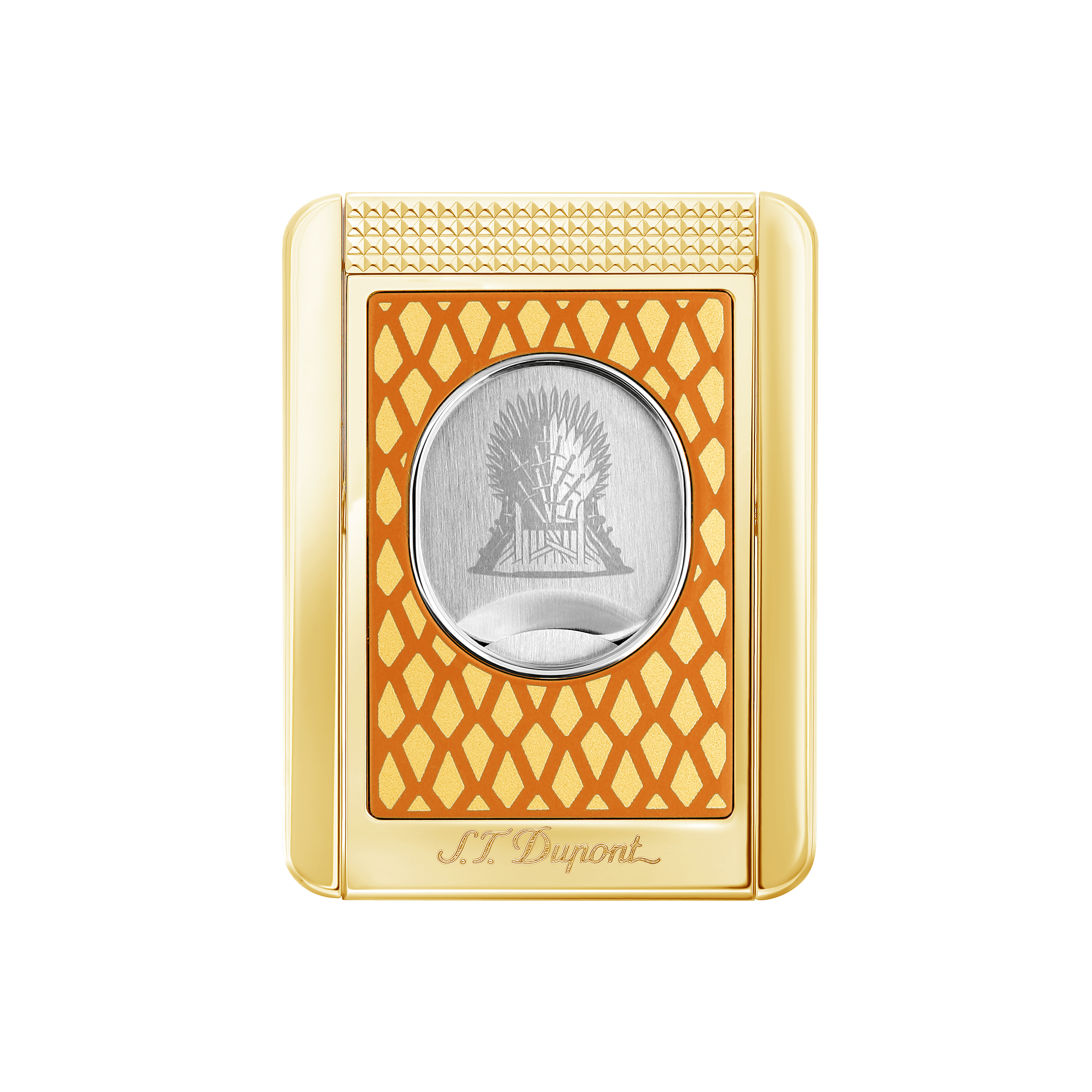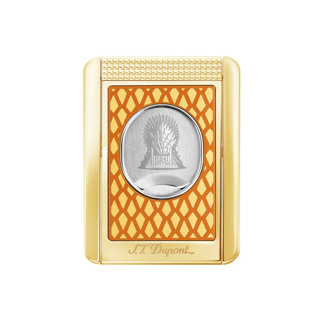 Cigar cutter with an orange dragon scale motif, engraved with the Game of Thrones and S.T. Dupont logos. Finished with gold and glossy lacquer.