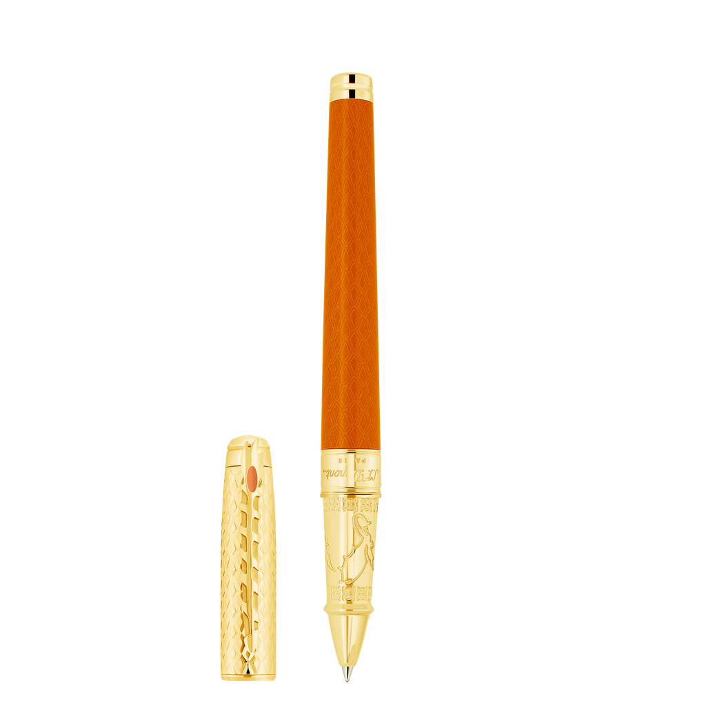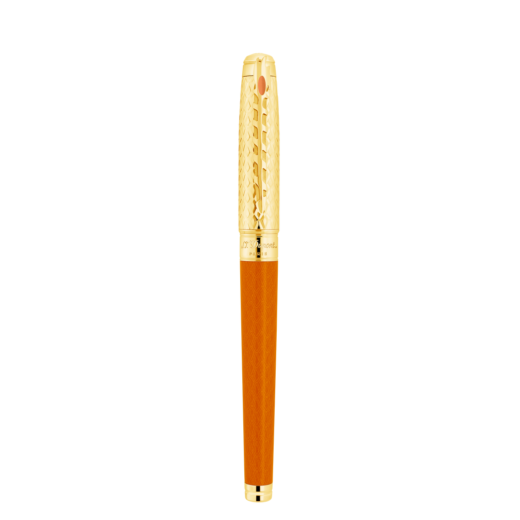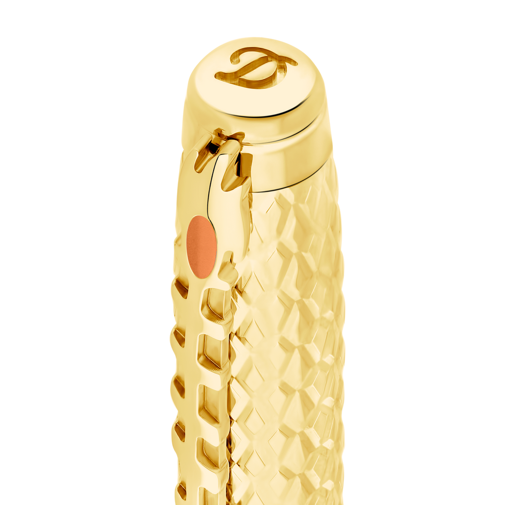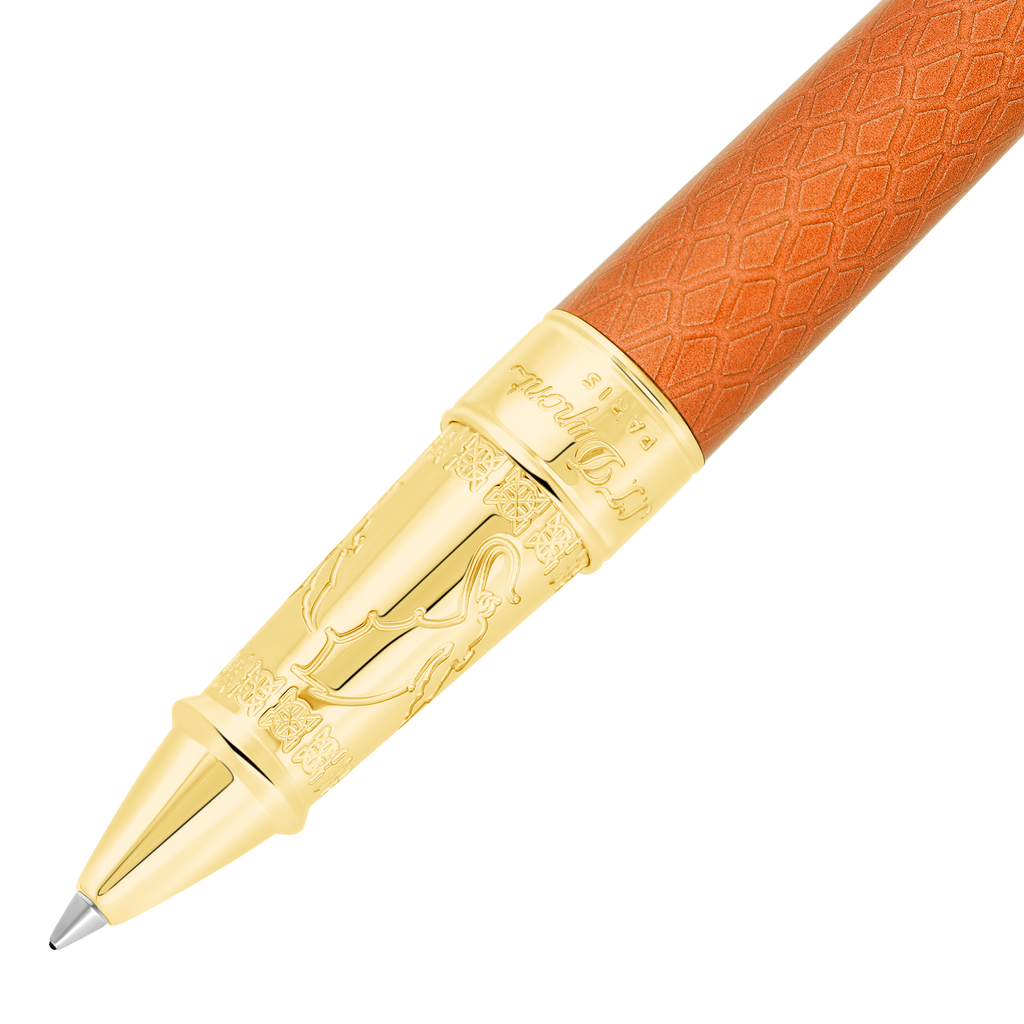 Line D Eternity large rollerball pen with orange dragon scale guilloché under lacquer and gold finishes. Cap adorned with dragon scale guilloché craftsmanship. Clip shaped like the Catspaw dagger. Dragons engraved on the barrel. Available in ballpoint, rollerball, and fountain pen versions. Made in our workshops in Faverges, France