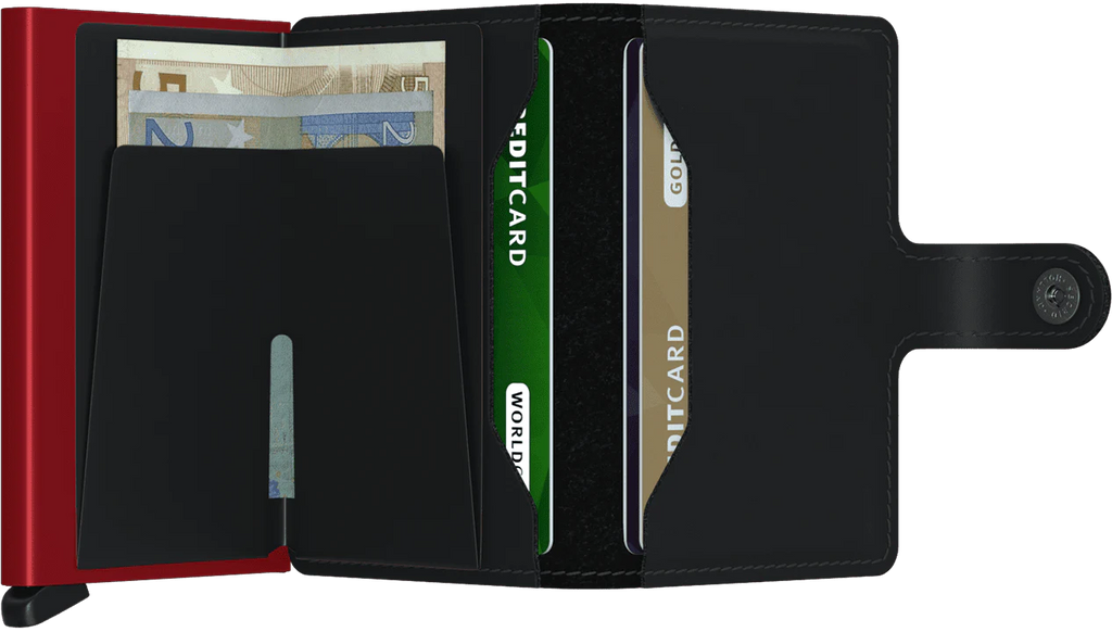 Small in size and surprisingly large in storage capacity, the Miniwallet combines the best of both worlds. The exterior holds banknotes, receipt and cards, while the aluminium Cardprotector allows you to slide out cards with one simple motion and protects them from bending, breaking and unwanted wireless communication.
